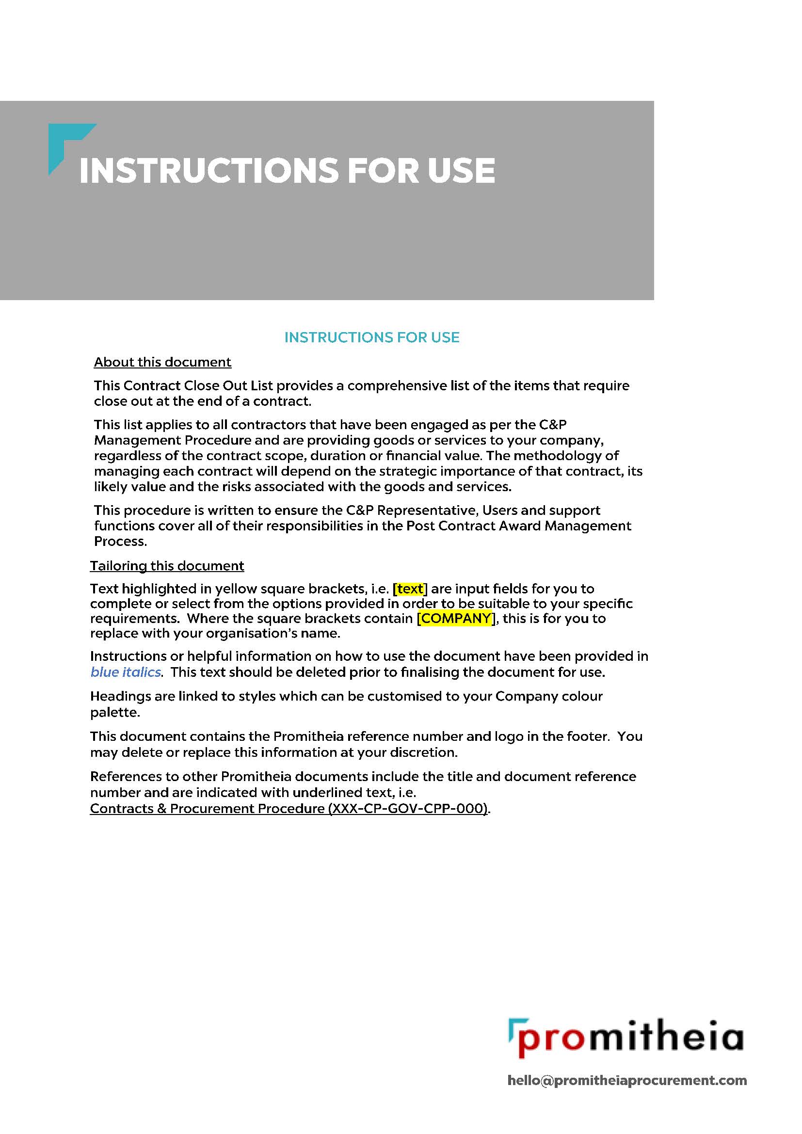 In addition to this Contract Close Out List, [COMPANY]’s personnel are required to comply with C&P Procedure and Contract Management Procedure.